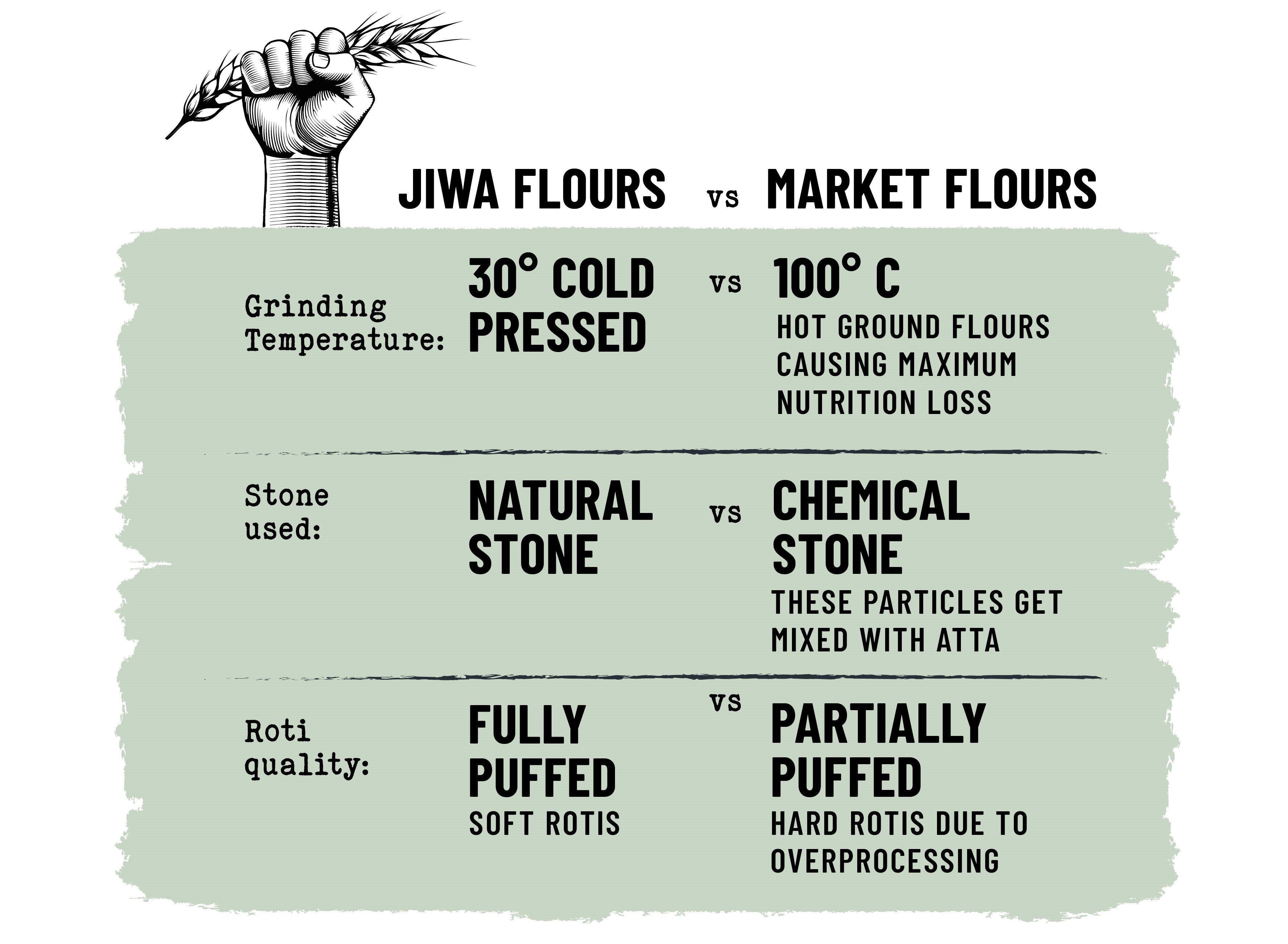 And so was born, Jiwa Cold Pressed Attas, a product that combines age-old milling practices with modern technology. Flours that are ground at ambient temperature, have the entire bran layer, retain the sweet taste of grain, and most importantly, make no compromise in nutrition, Food the way our grandparents ate.